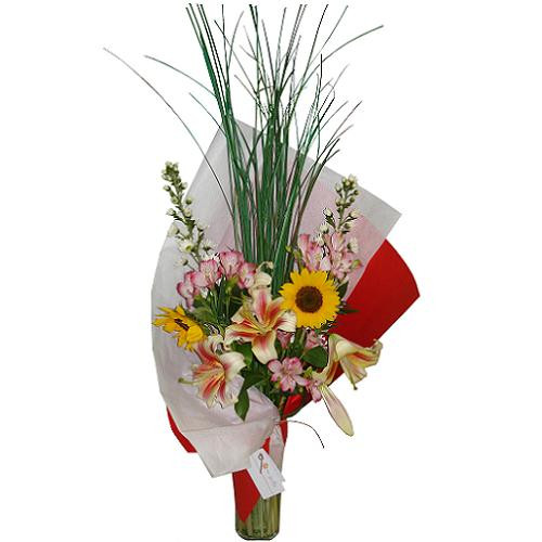 Con florero cilindro integrado por liliums, gerberas y flores de estación que dependiendo de la estación puede ser: girasoles, nardos, tulipanes, alhelies, fresias, iris, amapolas, azucenas; acompañados con hojas verdes. Envuelto en doble papel kraft y seda en combinación. Tamaño del ramo 110cm de alto y 60cm. de ancho.