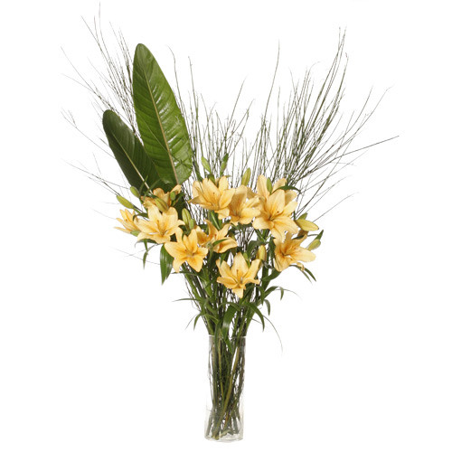 Compuesto por florero cilíndro de vidrio de 35 cm. de alto y 15 cm. de ancho. Con Liliums de 3 flores por vara, acompañados por follajes como retama, hojas de iris, limonium o solidago. Envuelto en doble papel kraft y seda, en los mismos tonos. Tamaño del arreglo 80 cm. de alto por 40 cm. de ancho.